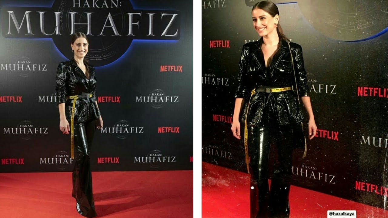 Hazal Kaya film galasında ışıltılı takımını endüstriyel Off White kemer ile kombinlemiş.